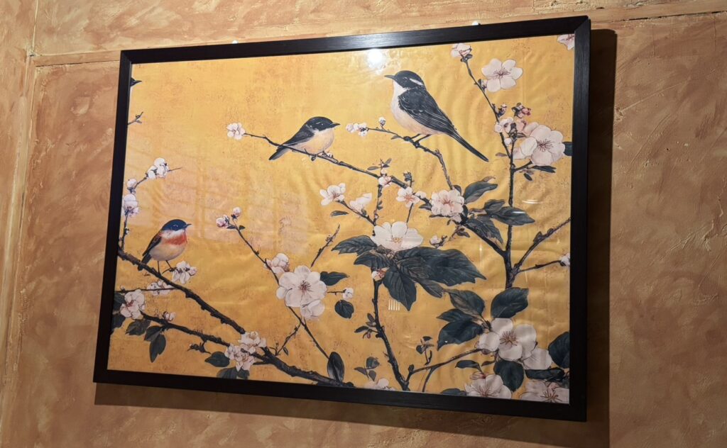 こちらの絵は、店名が「モズ」と鳥の名前であることにシンパシーを感じて茂木さんが自ら購入したもの。背景にある壁の塗装も本人がされた。